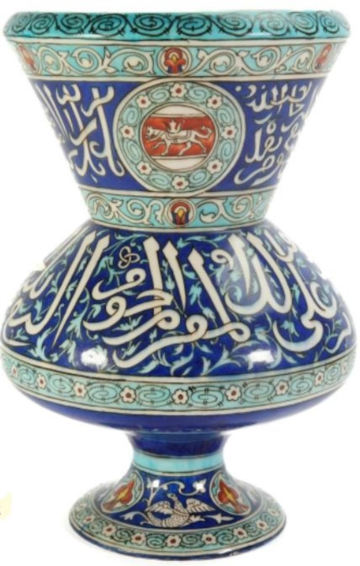 Each vase with a squat ovoid body and wide flaring neck and heightened foot, decorated in luminescent turquoise and deep blue colours, a running wide white text in Arabic jali thuluth outlined in black around the body set against a dense pattern of abstracted foliage, the neck decorated with singular decorative Arabic texts enclosing armorial devices with a saddled animal against a red ground, rim with scrolling black branches on blue ground,