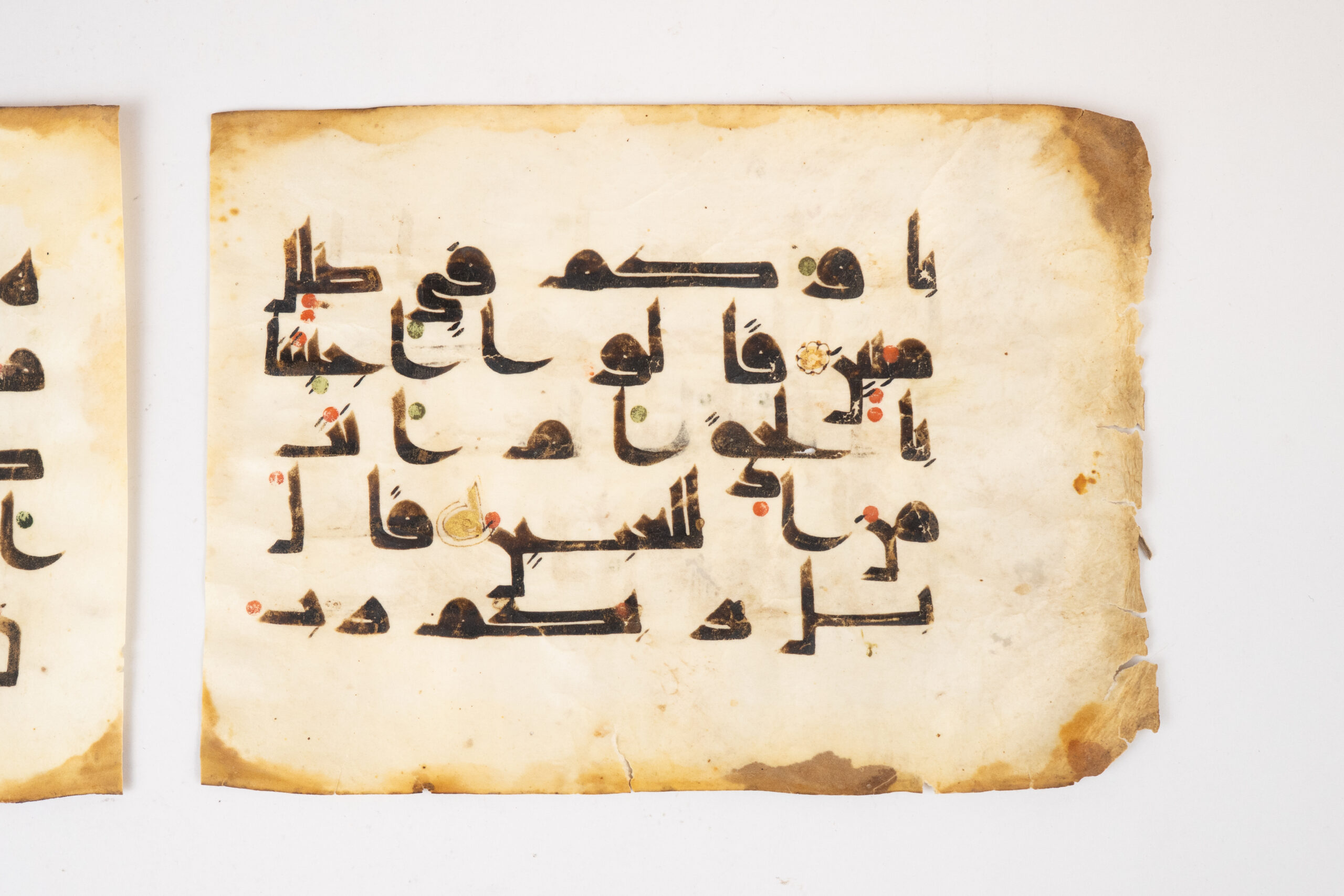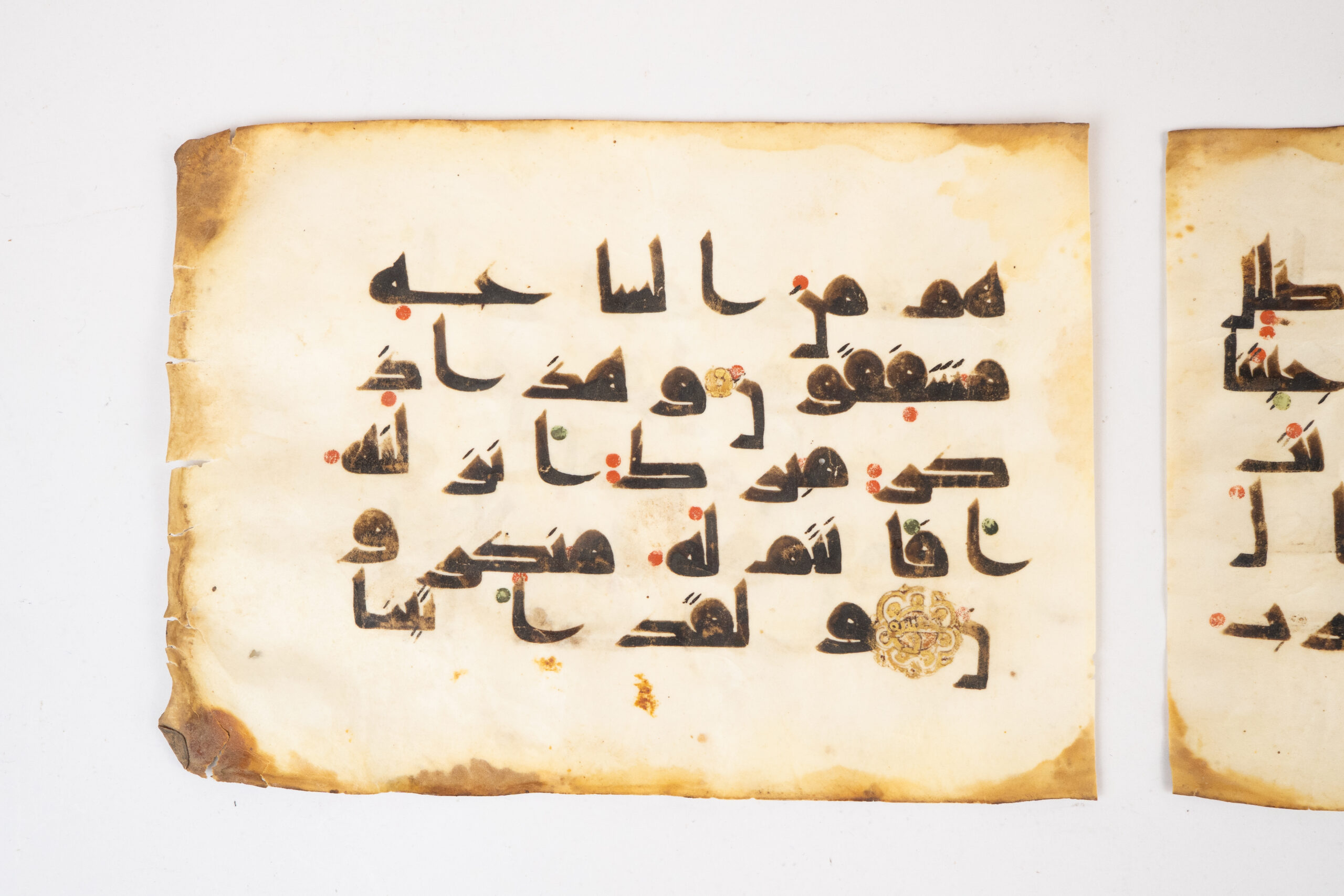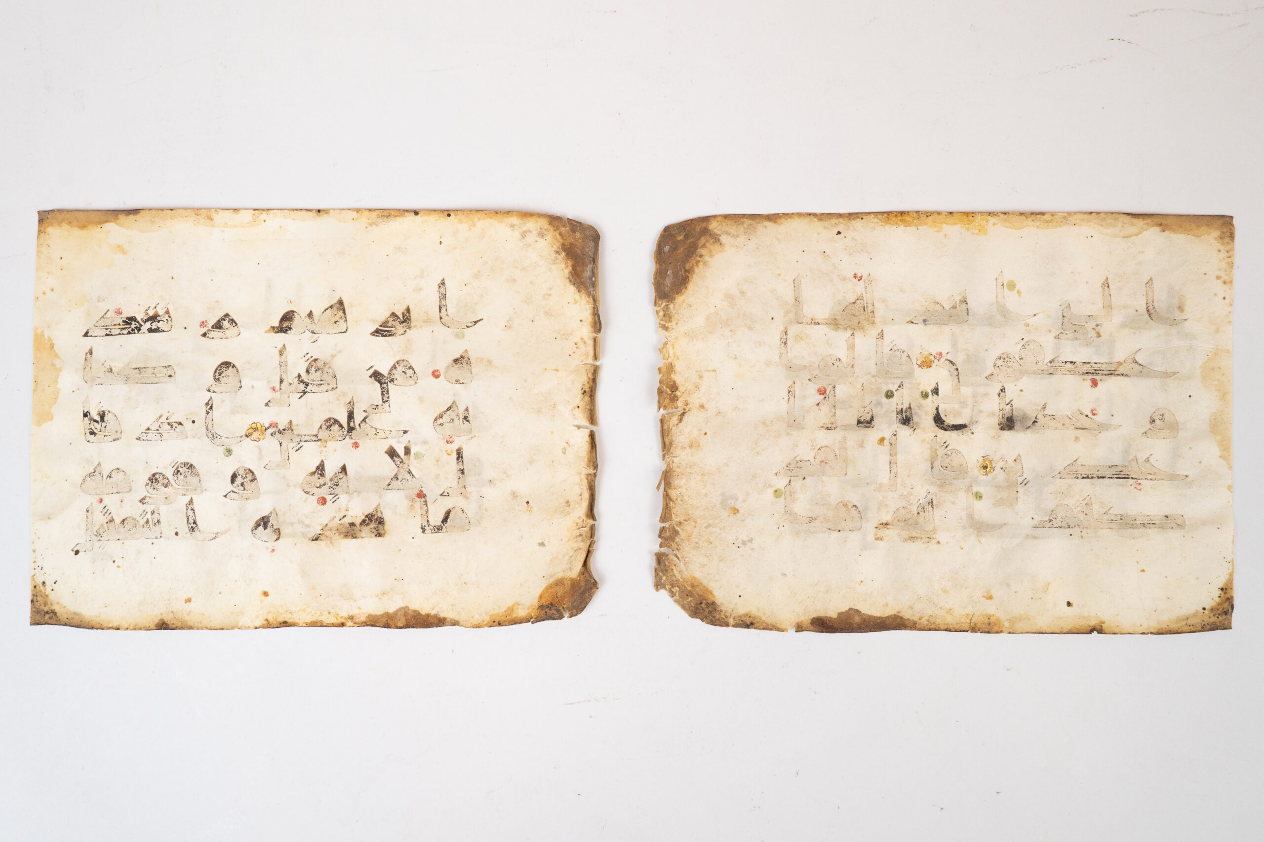The folios preserve an important early system of vocalisation and orthographic notation, including coloured diacritical dots in red and green indicating pronunciation, as well as early i‘jam strokes and dots used to distinguish consonants of similar form. Subtle traces of gilding and a small decorative rosette further attest that this was a carefully produced and prestigious manuscript, rather than a purely utilitarian copy.